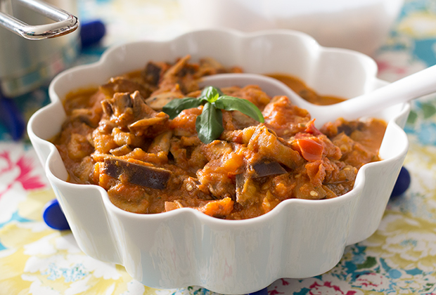 Oprindeligt lavede jeg denne ret, kun med auberginer og tomat, men efterhånden som jeg har lavet den rigtig mange gange har der været mange andre grønsager med på panden.