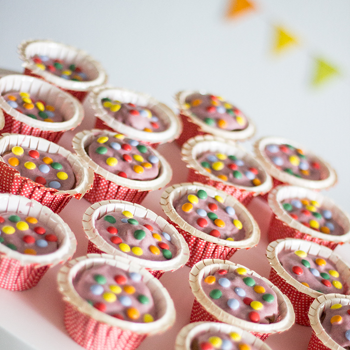 Cupcakes giver altid anledning til masser af pyntning! Dem her har jeg helt simpelt valgt at pynte med smeltet hvid chokolade, hvor jeg har tilsat lidt pink pastafarve så det bliver lidt mere festligt og så oven på chokoladen, er der pyntet med små chokoladeknapper i masser af farver.